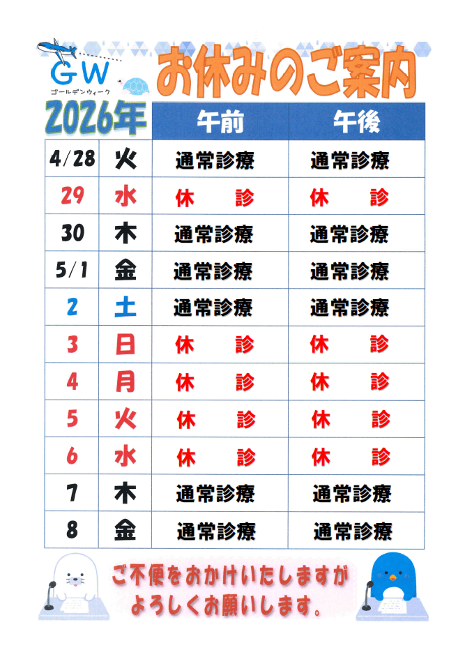 ゴールデンウィークの休診のお知らせ
